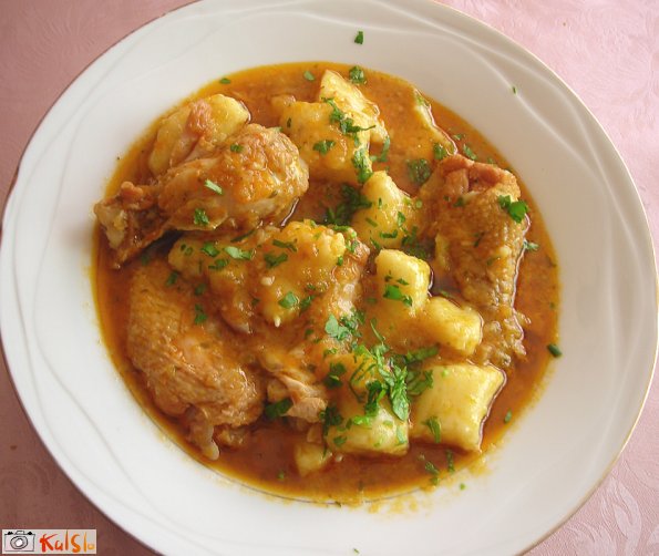 5Piščanca začinimo (sol, poper, vegeta), ga damo na vroče olje in malo prepražimo, da dobi barvo ter ga odstavimo na toplo. Na istem olju pražimo na drobno narezano čebulo, dokler se lepo ne razpusti. V strojčku na drobno sesekljamo vso zelenjavo in jo dušimo skupaj s čebulo, po malem dodajamo vodo, paradižnik (če je svež, ga drobno narežemo). Če se nam mudi, lahko vse skupaj malo zmeljemo s paličnim mešalcem, če ne pa počasi dušimo. Dodamo piščanca ter vse počasi kuhamo. Dodamo mleto papriko ter vino in še malo pokuhamo, da vino izpari. Na koncu dodamo peteršilj.