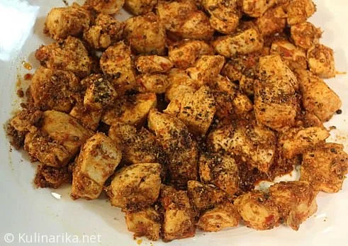 1. Meso narežemo na tanke trakce ali koščke. Semena koriandra stremo v možnarju in dodamo še ostale začimbe, dobro premešamo. Dodamo olje, zmešamo in dodamo na meso in še enkrat dobro premešamo. Pustimo, da se marinira.