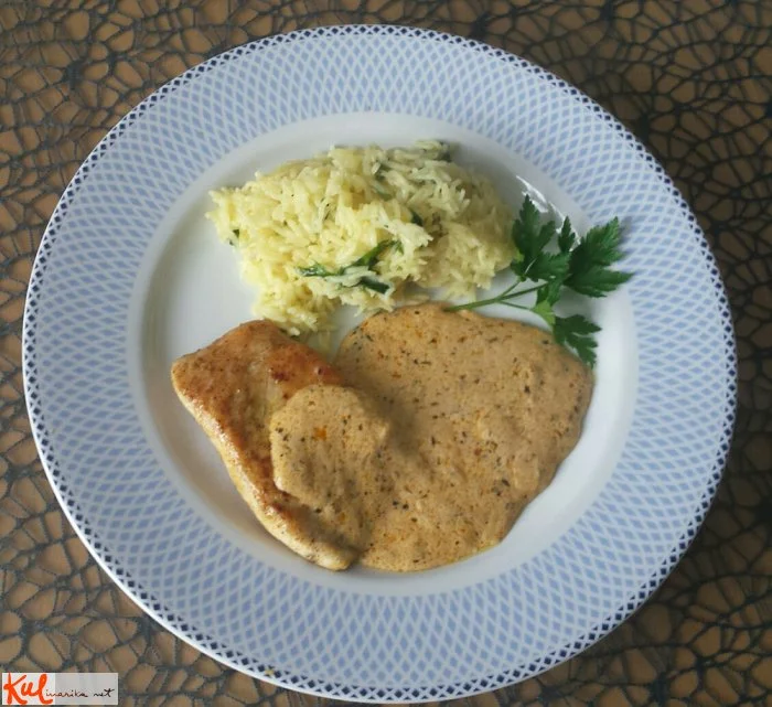 Piščančje zrezke na hitro spečemo v grill posodi, jih prelijemo z omako in postrežemo skupaj z rižem.