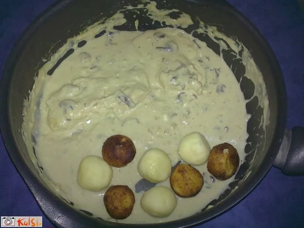 Piščančje fileje na hitro popečemo na olivnem olju. Ko rahlo zarumenijo, jih posujemo z nasekljanim česnom, da malo zadiši. Zrezke vzamemo iz posode in pripravimo omako (v posodi, kjer so se opekli zrezki). Prepražimo žlico moke, da nastane gosta omaka. Nato dodamo šampinjone, jih malo pokuhamo, dodamo 2 topljena sirčka in žlico kisle smetane, jušno kocko in mešamo, da nastane gladka omaka. Dodamo še zrezke in jih kuhamo 5 minut. Zraven postrežemo kruhove ali zdrobove cmoke. Pa dober tek!
