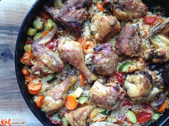 Med tem časom v kozici na olju prepražimo čebulo, dodamo na majhne kocke narezan korenček in papriki. Vse skupaj pražimo še približno 5 minut, nato vanj stresemo riž ter mešamo, da zastekli. Nato piščanca vzamemo iz pečice in vmes razporedimo riž z zelenjavo. V kozici zavremo tri skodelice vode (3x toliko, kot smo dali riža) in notri raztopimo eno jušno kocko ter polijemo po piščancu in rižu. Vse skupaj damo nazaj v pečico za cca. 30 minut oz. dokler vsa tekočina ne izpari in ostane riž suh.