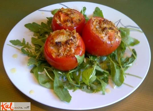 Ponavadi polnjene paradižnike postrežem na solati iz rukole. Rukolo pooljim z olivnim oljem in okisam z limono.