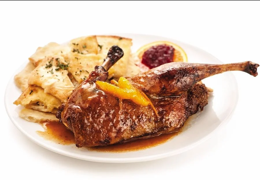 3. Pomarančna omaka: tretjino pomaranče tanko olupimo in lupino narežemo na zelo tanke trakce, nato celo pomarančo sfilitiramo. Iz dveh pomaranč in polovice limone iztisnemo sok. V ponvi karameliziramo sladkor. Zalijemo ga s kisom ter pomarančnim in limoninim sokom. Prilijemo še sok, ki je nastal pri pečenju race ali gosi, vendar mu prej odstranimo odvečno maščobo. Vse skupaj kuhamo še minuto ali dve, nato dodamo narezano pomarančno lupino in kuhamo še 5 minut. V kozici razpustimo maslo, ki mu primešamo moko in z njim zgostimo omako. Pred koncem jo obogatimo še z brusničnim džemom in s prej pripravljenimi koščki pomaranče ter jo po potrebi dosolimo in popramo. K raci ali gosi postrežemo mlince, ki jih pripravimo po navodilih na embalaži.