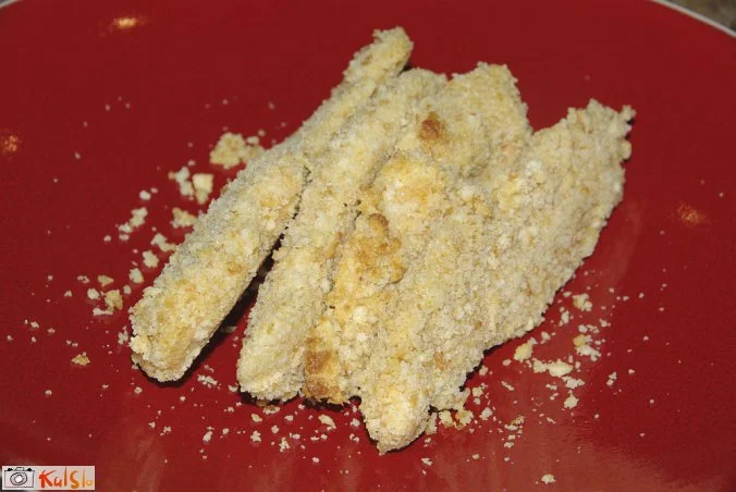 V prvi krožnik stresemo par žlic moke za paniranje. V drugem krožniku razžvrkljamo jajci s soljo. Po želji lahko dodamo kajensko papriko, poper ali celo dimljeno papriko. V tretji krožnik stresemo pripravljene drobtine. Piščančje trakce povaljamo v moki, nato v jajcu in nazadnje v drobtinah. Drobtine nekoliko pritisnemo na meso, da se bolje primejo.