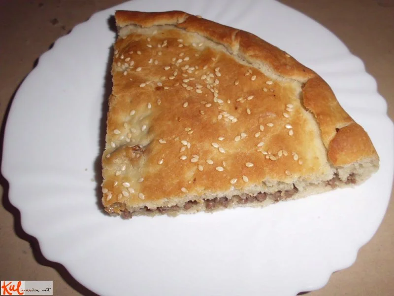 Vzhajano testo razdelimo na 4 dele in pripravimo 2 manjša okrogla pekača. En del testa razvaljamo in damo v namaščen pekač. Naredimo malo roba s testom v pekaču. Razporedimo polovico mesa po testu in pokrijemo z drugim delom testa, ki smo ga razvaljali manj kot prvi del. Robove prvega dela testa zavihamo čez drugi del testa in rahlo stiskamo, da nam meso ne uhaja ven. Ponovimo še enkrat za drugi pekač.