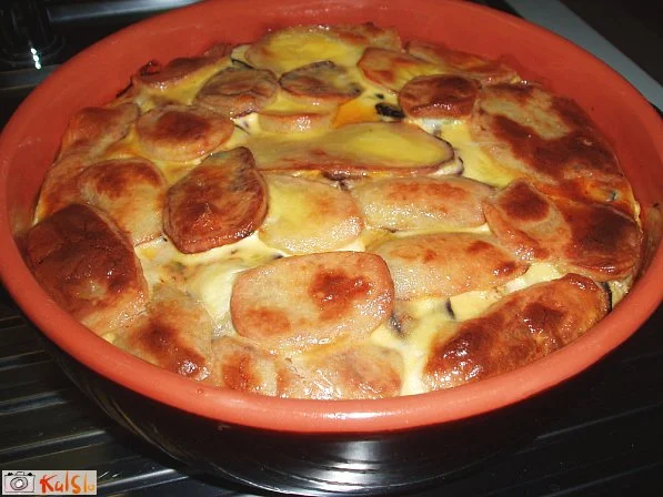 V naoljeno posodo (jensko steklo, rimski lonec,...) denemo plast krompirja, plast mesne mase in plast jajčevcev. To nekajkrat ponovimo in končamo tako, da je na vrhu plast krompirja. Ob robu prilijemo malo juhe in v pokriti posodi pečemo približno 40 minut.