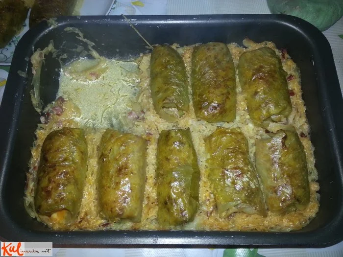 Mleto meso in slanino na čebuli in olju malo prepražimo, dodamo skodelico riža, jajce, strok strtega česna, solimo, popramo, dodamo malo majarona in mlete paprike ter dobro premešamo. S tem napolnimo zeljnate liste in oblikujemo v sarme. Na olju in čebuli prepražimo na koščke narezano slanino, dodamo 2 dcl suhega belega vina, 500 g ožetega kislega zelja, 2 stroka strtega česna, 2 žlici mlete rdeče paprike, malo mlete kumine, malo soli. Zmešamo ter malce podušimo, dodamo 1 dcl kisle smetane ter premešamo. V glinast ali ognjavaren pekač razporedimo najprej plast dodatka, nanj naložimo sarme, vmes pustimo prostor, ki ga zapolnimo z ostalim dodatkom. V pečici približno 1 uro in pol na 175 počasi naprej dušimo.