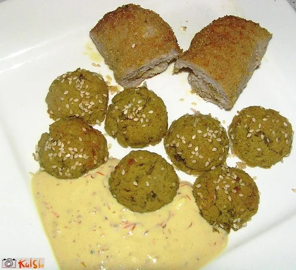 Zvitki so postreženi z grahovimi polpetki v žafranovi omaki.