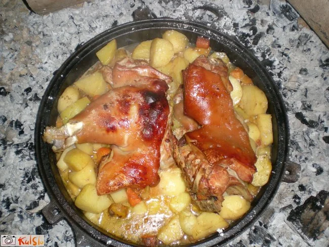 1 do 2 uri pred začetkom pečenja odojka nasolite in natrite s poprom. Prednjo četrt odojka (vrat, pleče in rebra) vam lahko mesar malo naseka (kosti), da bo po pečenju rezanje lažje. Krompir olupite in narežite na večje kose. Korenček razrežite na kolobarje, kolerabo na večje kose. Čebulo prerežite na pol, česen lahko pustite cel, peteršilj drobno sesekljajte. Prekajeno slanino razrežite na kockice. Na pripravljeno žerjavico (najboljša je iz bukovih drv) postavite spodnji del posode. Počakajte, da se segreje in dodajte olje. Dodajte na koščke narezano slanino in jo kratek čas cvrite da postekleni. Odojka lahko na hitro opečete na olju, da koža zakrkne. Odojka odstranite in v posodo dodate nasoljen, popopran, naoljen krompir (z dodanim peteršiljem), korenček, kolerabo, čebulo, česen ter jušno osnovo. Na vrh položite odojka (s kožo navzgor). Pokrijte s pokrovom in zasujte z žerjavico. Čez 3/4 ure odkrijte, odojka obrnite, zelenjavo premešajte. Čez 1 uro odkrijte, zelenjavo premešajte, odojka obrnite in na kožo položite nekaj koščkov masla, da steče. Lahko dodate tudi dl belega suhega vina (po okusu). Pecite še 1/2 do 3/4 ure pod močno žerjavico, da koža dobi zlatorjavo zapečeno barvo. Postrezite kar v posodi od peke (da obdrži temperaturo) - meso pa položite na leseno desko in ponudite gostom razrezano na manjše kose. Dober tek!
