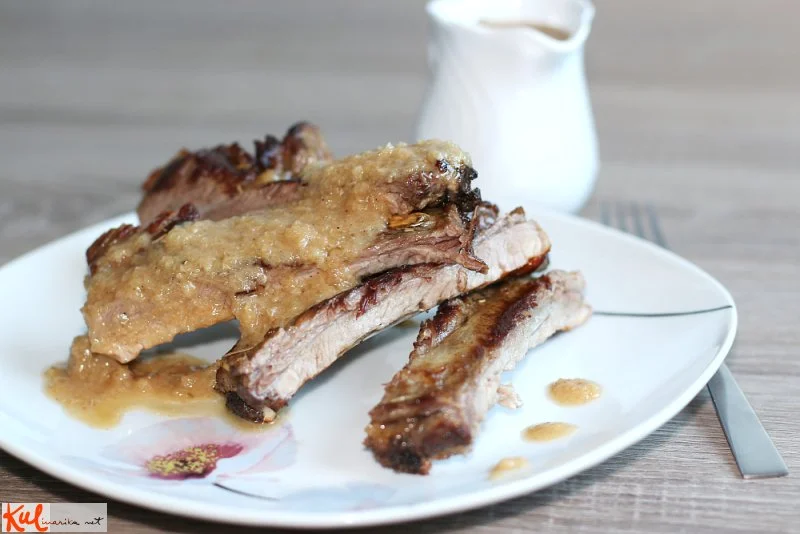 v pečici pečena svinjska rebrca s šampanjcem, čebulo in česnom