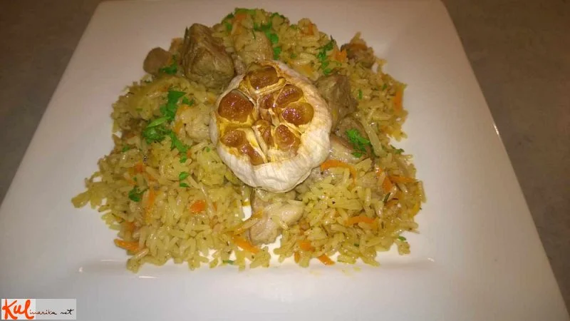 Medtem ko se česen peče, pripravimo meso in riž. Čebulo olupimo in narežemo na rezance, korenje grobo naribamo, črni poper in kuminova semena v možnarju stremo v prah. Meso narežemo na manjše kose in ga nasolimo. Zavremo zelenjavno osnovo ali govejo juho ali osnovo. V zadosti veliki posodi, ki je primerna tudi za uporabo v pečici, močno segrejemo svinjsko mast in kose mesa hitro opečemo z vseh strani, da lepo porjavijo. Meso vzamemo in shranimo na toplem. Temperaturo nekoliko znižamo. Na isto maščobo damo čebulo, premešamo in čebulo med občasnim mešanjem počasi pražimo, da se razpusti in začne karamelizirati.