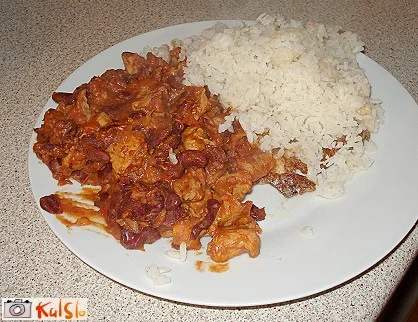 Sesekljamo mlado čebulo in jo na vročem olju prepražimo (nekaj jo prihranimo za riž). Dodamo na drobno narezan paradižnik in ga popražimo, nakar dodamo pločevinki rdečega fižola, da se tudi ti prekuhata, začinimo s soljo, poprom in papriko ter dodamo polovico Knorr kocke.