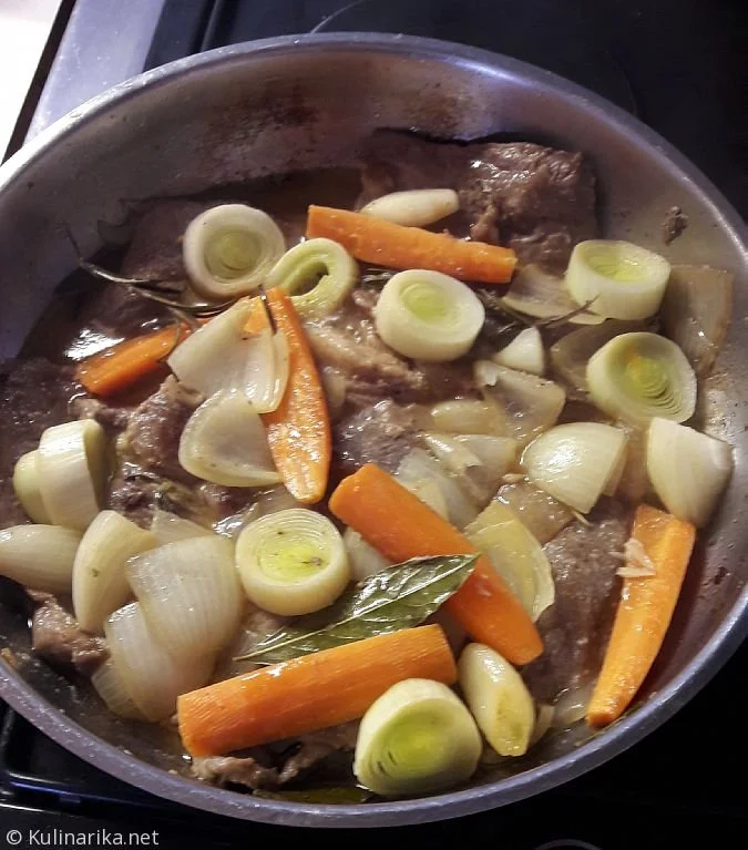 Svinjske zrezke potolčemo, jih posolimo, popramo in potresemo s česnom v prahu. V ponvi segrejemo maslo in opečemo zrezke iz obeh strani. Med pečenjem dodamo vino. Ko so zrezki popečeni, dolijemo vodo, dodamo česen, ki ga pustimo v strokih. Čebulo narežemo na četrtine, korenček prerežemo najprej na polovico in potem še dvakrat po dolžini na tanjše trakce. Dodamo lovorjeve liste in rožmarin ter pokrito kuhamo do mehkega. Vmes zalivamo z vodo in dosolimo.