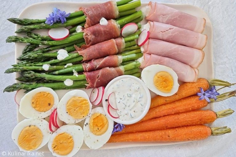 Na krožnik razporedimo šparglje s pršutom, zvitke s šunko, kuhana jajca, narezane redkvice in omako.