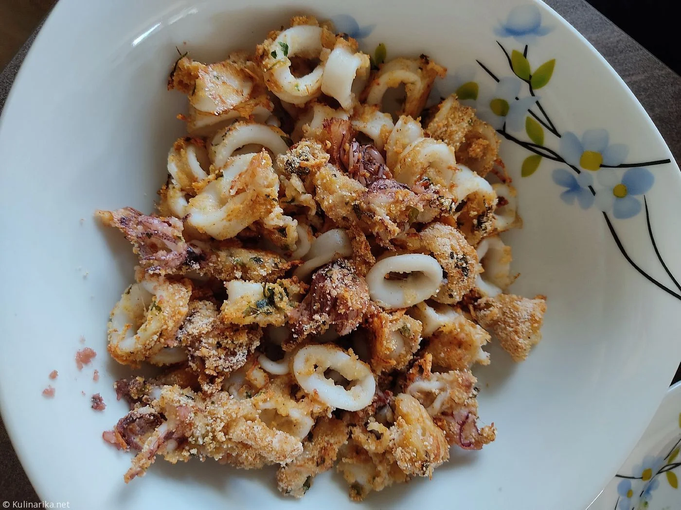 5Najprej naredimo panado iz krušnih drobtin, naribanega parmezana, sesekljanega peteršilja, naribane lupine ene limone, česna v prahu, soli, popra in tri ščepce dimljene paprike. Kalamare očistimo, narežemo in posušimo v papirnati brisači. Nato jih pošpricamo z olivnim oljem, premešamo in pest kalamarov damo v panado, na rahlo zmešamo in jih preložimo na pekač s peki papirjem. Seveda se medtem že ogreva pečica na 180 stopinj in jih pečemo 15-17 minut.