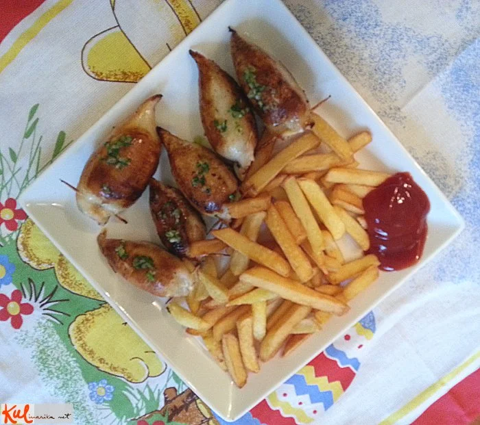 Kalamare očistimo. Okoli sira zavijemo pol rezine pršuta in vstavimo v kalamar. Kalamare na koncu zapremo z zobotrebci, da sir ne odteče ven.