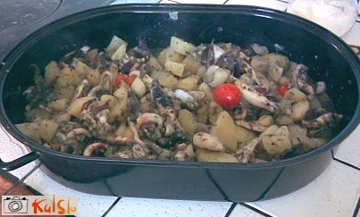 Jed lahko pripravite tudi z lignji, le čas pečenja prilagodite, da se preveč ne izsušijo, če so manjši.