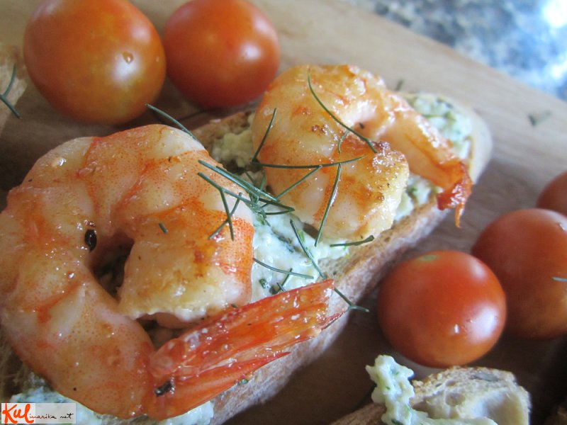 Kruh narežemo na poševne rezine in jih na gril plošči popečemo bolj na trdo, recimo kot za toast. Po želji lahko pred peko kruh pokapamo z olivnim oljem.
