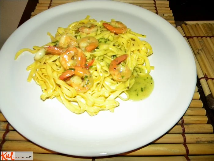 Na krožnik damo najprej rezance, katere prelijemo z narejeno omako ter škampi.