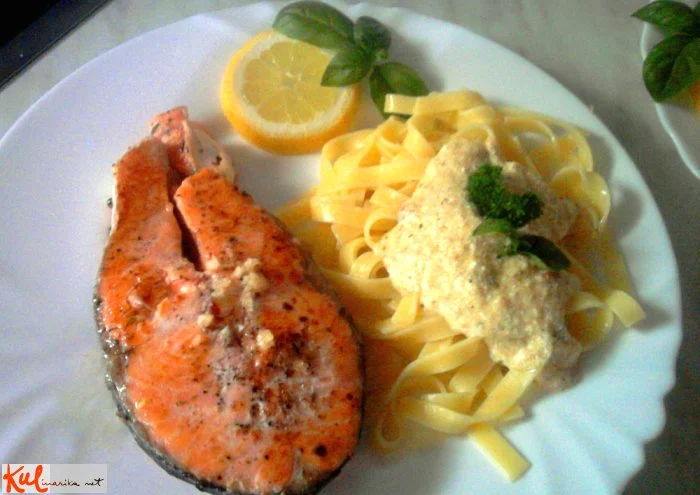 Pripravimo lososa: na segreto olivno olje položimo lososa, začinjenega s soljo, poprom in žlico svežega nasekljanega kopra. Popečemo na vsaki strani 3 minute.