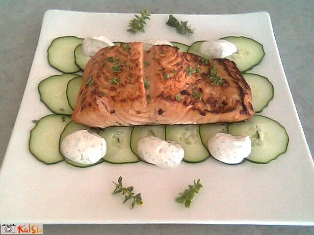 Pečen lososov file postavimo na tanke kolobarčke kumare, posujemo z listki limonskega timijana, solimo z grobo morsko soljo in okrasimo s koprovo smetano.