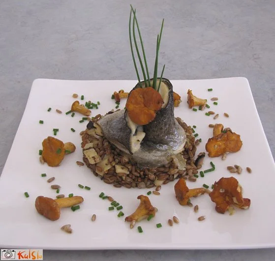 sočno pečen file postrvi na kuhani rži, ki je pražena z jurčki in lisičkami