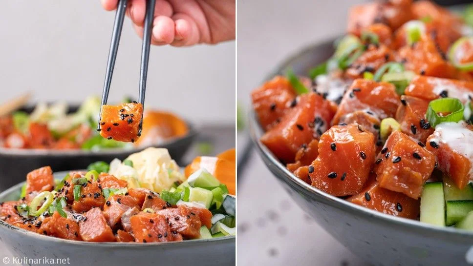 3. Dodaj na kocke narezanega lososa in 1-2 žlički sezamovih semen ter premešaj.