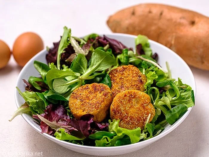 Najprej v vodi 10–15 minut kuhamo narezan sladki krompir. Potem ga odcedimo in zmečkamo z vilicami. Dodamo tunino, nasekljano mlado čebulo in rdečo čebulo, jajce, začimbe in sol. Z roko oblikujemo polpete in jih popečemo na ponvi z nekaj kapljicami oljčnega olja. Postrežemo z zeleno solato.