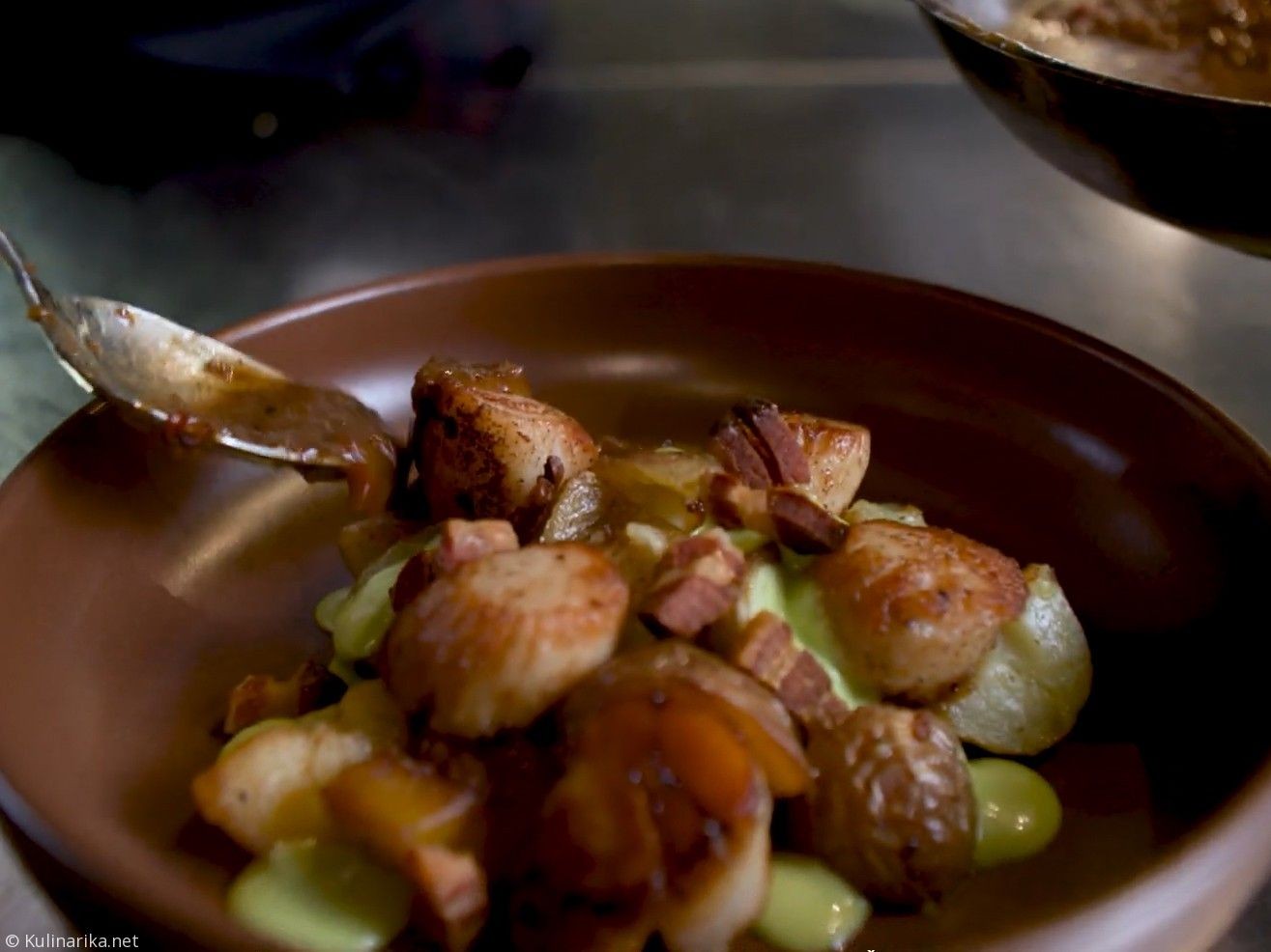 Pokrovače previdno položimo na vročo mast in jih pečemo na vsaki strani 2 minuti. Zunaj naj dobijo malo barve, znotraj naj bodo še steklene. Poberemo jih iz ponve.