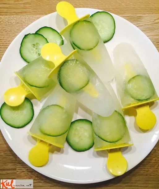 Mešanico nalijemo v plastične modelčke ter za dekoracijo dodamo 2 tanki rezini kumare ali limone. Modelčke damo v zmrzovalnik za 2 do 3 ure.