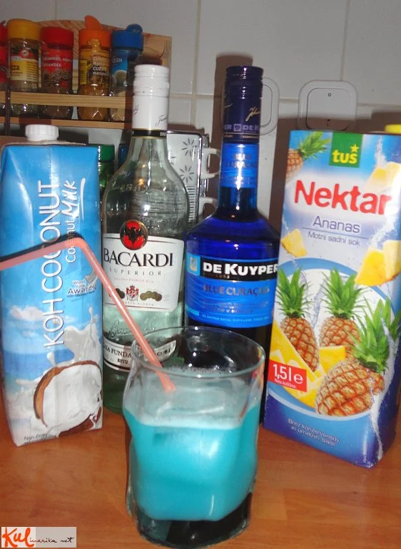 V shaker stresemo ledene kocke. Dodamo določene količine sestavin (beli rum, blue curacao, ananasov sok, kokosovo mleko).