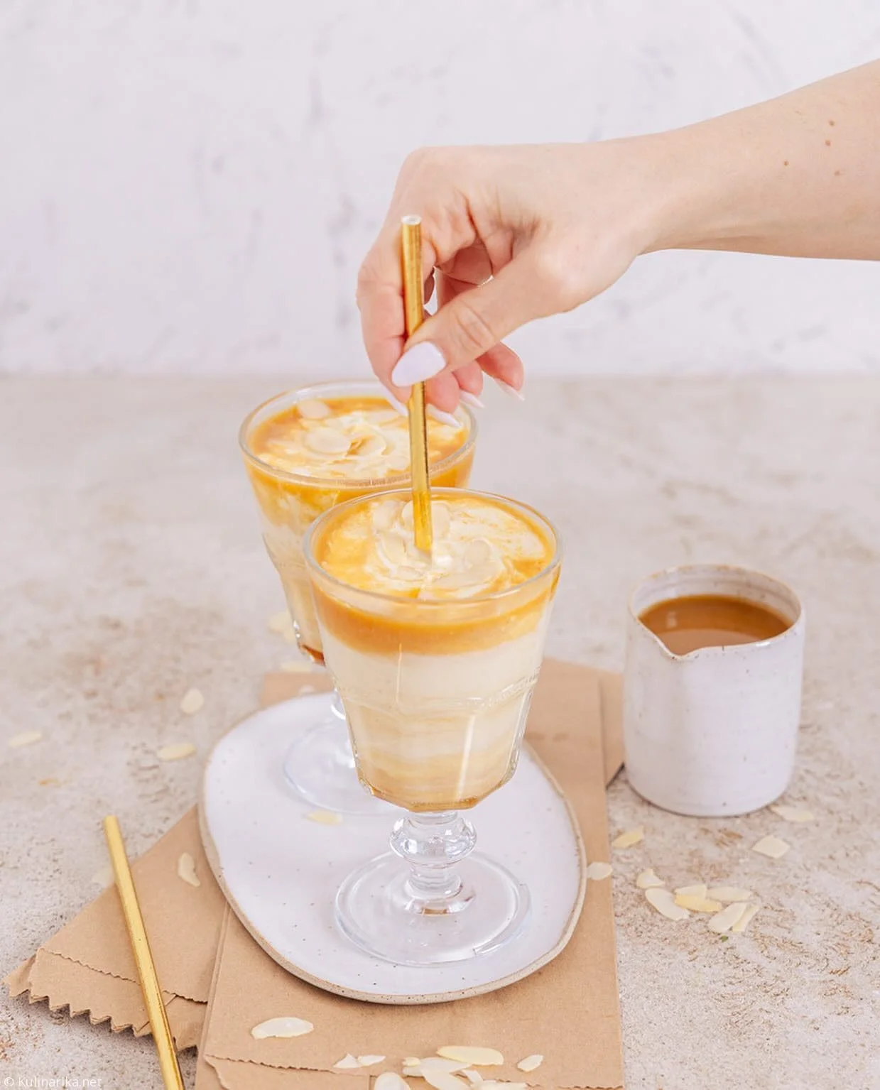 V kozarčke dodamo po žlico javorjevega sirupa in malo pasijonkine kaše, ter vse skupaj prelijemo s pripravljenim napitkom. Dodamo mandljeve lističe in postrežemo.