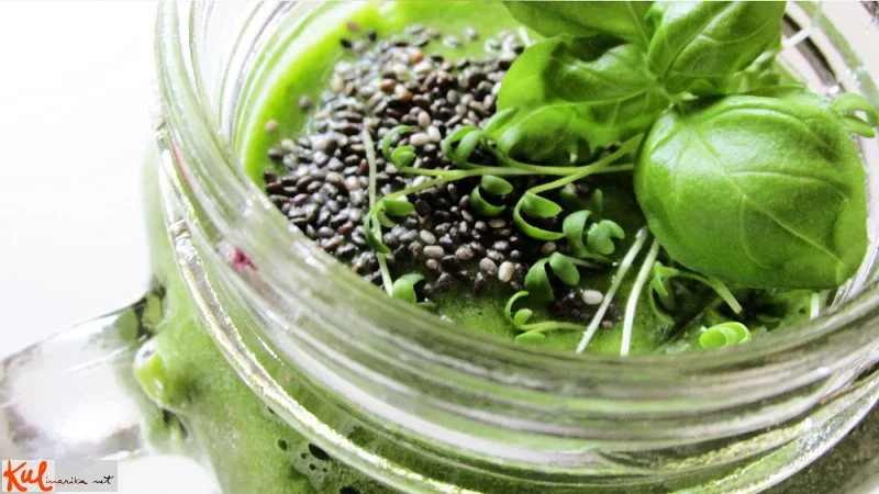 Smoothie na sliki ima po vrhu posuta chia semena in mikro zelenje (kreša in bazilika).