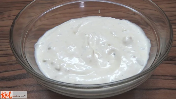 Majonezo, gorčico, peteršilj, na drobno narezane kisle kumarice ter stisnjen česen dobro zmešamo s paličnim mešalnikom. Dodamo poper po okusu in zmešamo. Na koncu dodamo še 1 kislo smetano katero primešamo z žlico in ne s paličnim mešalnikom, da se omaka ne "utekočini" preveč.