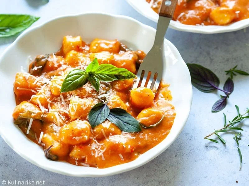 3. Ko je omaka pripravljena, jo lahko po želji na hitro pretlačimo s paličnim mešalnikom, nato pa v omako dodamo še njoke in sesekljano baziliko ter začinimo s soljo in poprom po okusu.