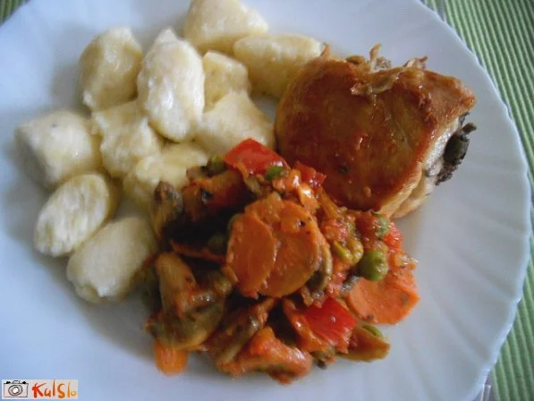 Na čebuli in česnu prepražimo gobice, dodamo vso narezano zelenjavo, dodamo začimbe, zalijemo z vodo in pustimo na rahlem ognju dušiti do mehkega. Na koncu potresemo jed z žličko moke, zmešamo in posujemo s sesekljano svežo baziliko.