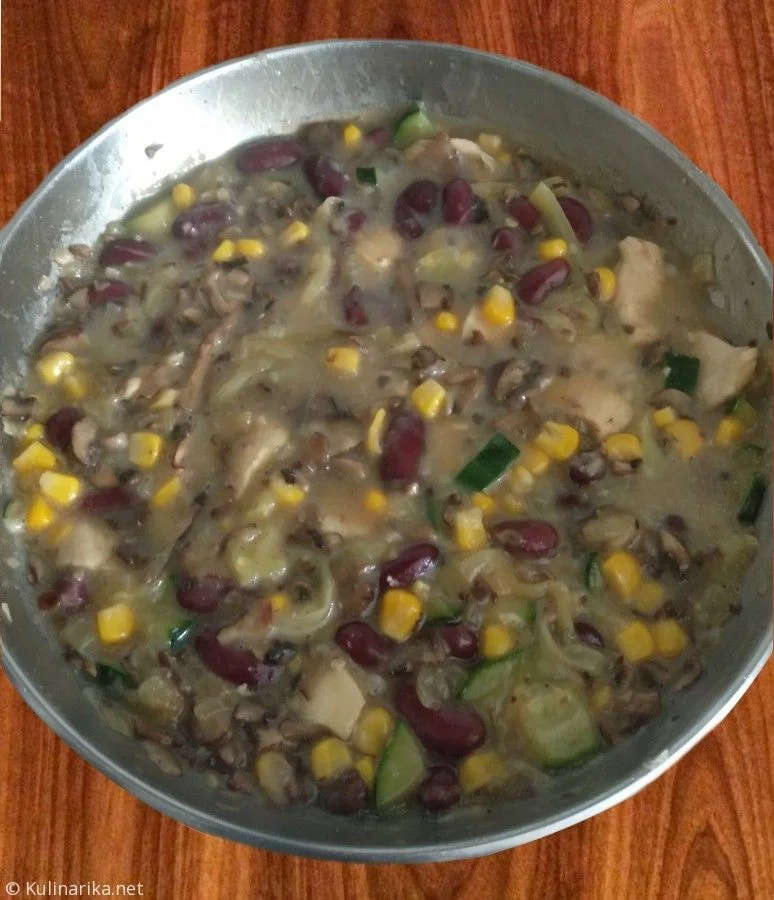 Občasno premešamo. Ko se bučke zmehčajo, v ponvi pa imamo še vedno nekaj soka, dodamo koruzo in fižol iz konzerve. Dodamo še 1/2 žličke vegete. Ker je oboje že kuhano, pokrijemo ponev in pustimo 2-3 minute, da se okusi premešajo. Po okusu tudi solimo.