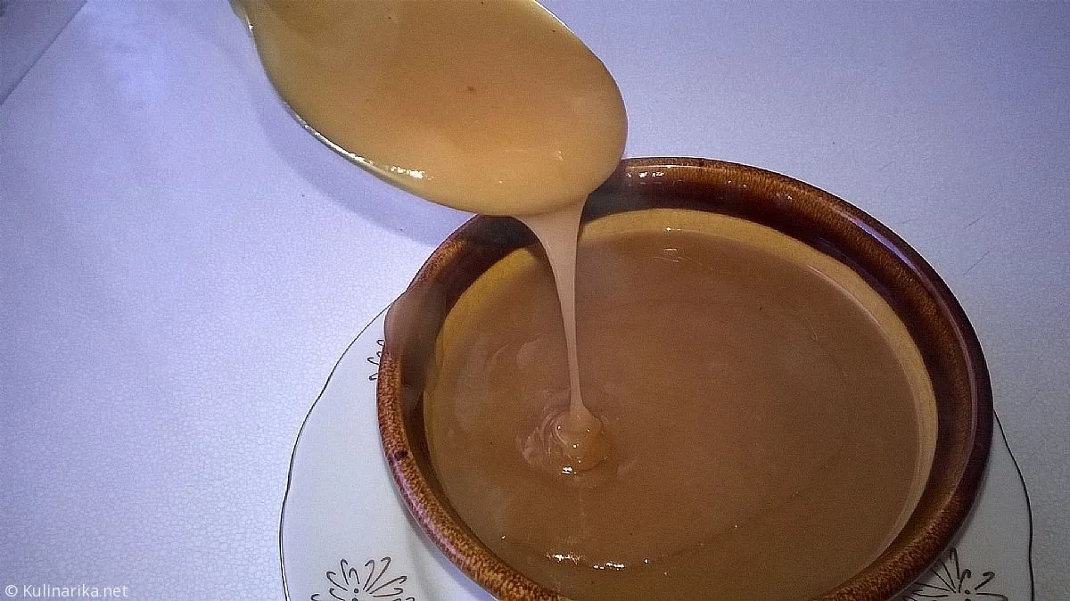 1. V posodo s pološčenim dnom ali teflonom najprej damo olje, takoj za tem vsujemo mešanico moke, sladkorja in soli ter na ne prevročem ognju, ob stalnem mešanju, spražimo do karamelne barve. Zalijemo z mešanico vina in vode, da zmes karamelizira (moka in sladkor otrdita), dodamo vse dišavnice in ob stalnem mešanju počasi kuhamo, pri tem se bo karamela s pomočjo vina popolnoma razpustila in počasi prehajala v gost žele. Žele precedimo (na cedilo s srednjimi luknjicami) v omačnico in do serviranja postavimo v toplo vodno kopel.