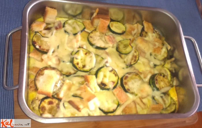 V pekač damo bučke in jih razporedimo po dnu pekača. Prelijemo z pol smetane, ki smo jo zmešali. Po smetani razporedimo toast, ki smo ga narezali na kvadrate 2x2 cm.