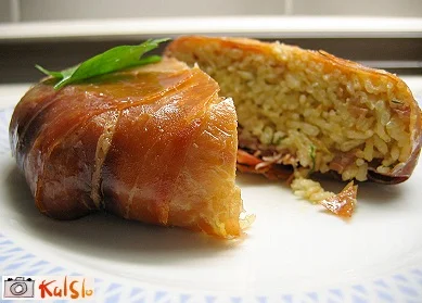 Model obložimo z rezinami pršuta, tako da je dno pokrito in nam gleda čez rob modela. Nato model do roba napolnimo z riževo zmesjo. Na koncu riž "pokrijemo" s pršutom, ki nam je visel čez rob modela. Model nato postavimo v pečico in 30 minut pečemo pri 180°C. Nato ga vzamemo iz pečice, malo ohladimo in zvrnemo na pladenj. Pladenj postavimo na mizo in kupolo narežemo na posamezne porcije.