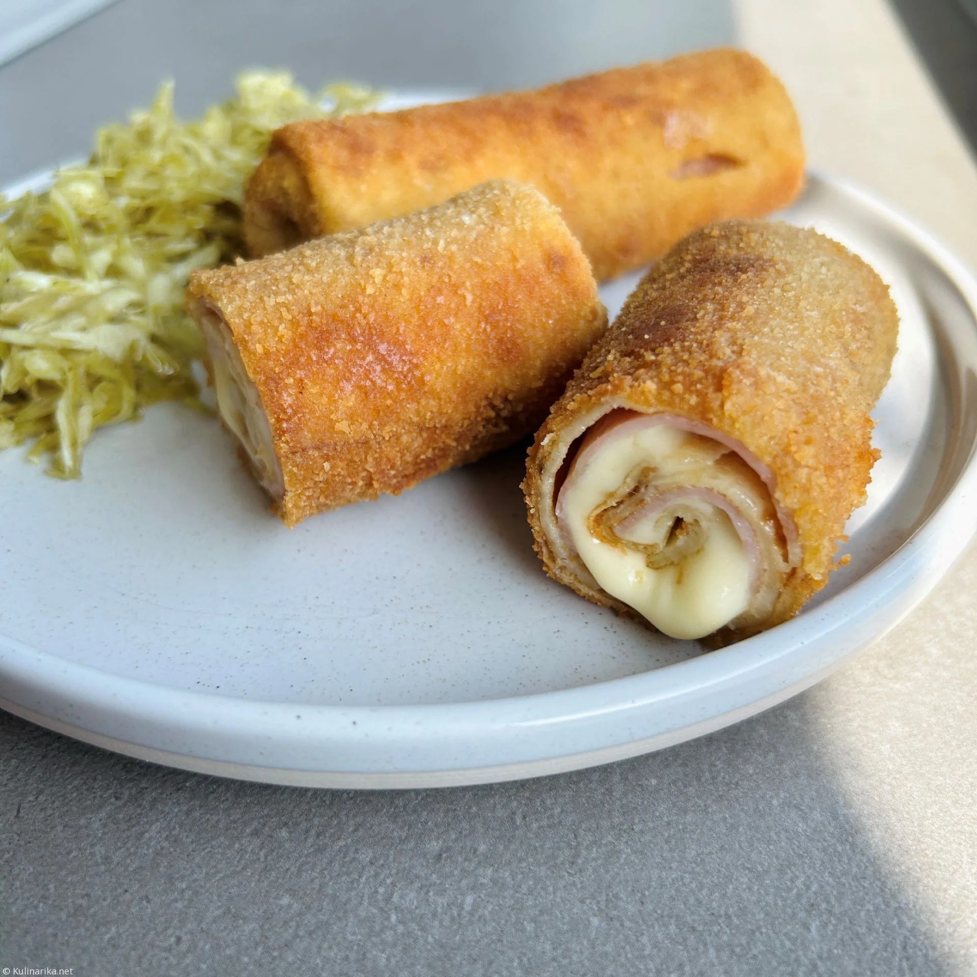 Na vsako palačinko položi šunko in sir in previdno zavij v valjček.