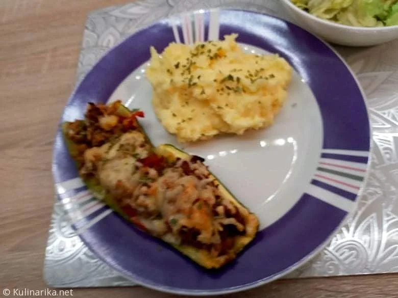 Vse skupaj dušimo od 15 - 20 minut. Nato z oljem premažemo pekač in položimo očiščene bučke ter jih napolnimo z mesom in zelenjavo, ki jo predhodno prepražimo. Pečico segrejemo na 180 stopinj, pekač z bučkami prekrijemo s folijo za kakšnih 10 minut, nato folijo odstranimo in bučke potresemo s sirom. Pečemo, da se sir stopi in popeče. Polnjene bučke lahko ponudimo s pire krompirjem in solato, tako kot sem jaz, lahko pa tudi drugače po vašem okusu.