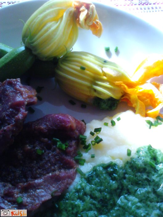 Pri nam pa cvetove napolnimo z šunko in sirom ,nato jih pomočimo v gosto maso tako kot za palačinke in ocvremo ,zraven se zelo prileže kisla smetana z česnom.