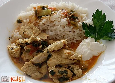 Meso narežemo na večje koščke, jih posolimo in potresemo s curry-jem (količina po želji). Na vročem olju prepražimo čebulo, dodamo meso in ga dobro popečemo. Dodamo narezano papriko in sesekljan strok česna. Vse skupaj dušimo toliko časa, da se paprika omehča. Občasno zalijemo z malo vode. Nato dodamo še narezan paradižnik, nasekljano zeleno in peteršilj, posolimo, potresemo s curry-jem (po okusu) in dušimo 5-10 minut. Po potrebi dolivamo malo vode, tako da dobimo malo goste omake. Mesu in zelenjavi primešamo skuhan riž, dobro premešamo in še kakšno minuto pražimo. Ponudimo.