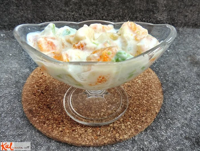 Banane olupimo in narežemo na kolobarje. Jabolka in pomaranče očistimo pešk in ravno tako narežemo na majhne koščke. Čez sadje prelijemo jogurt in narahlo premešamo. Po želji čez sadje prelijemo med, ki ga predhodno toliko segrejemo, da postane tekoč.