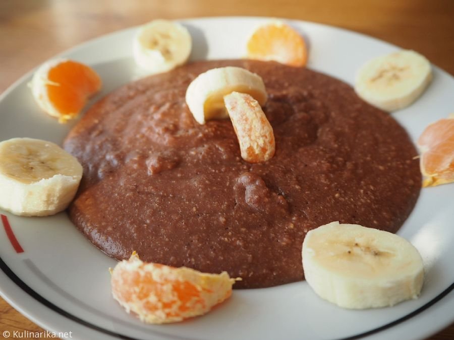 2. Za vsako porcijo uporabimo približno 70 g mešanice, kateri dodamo kokosovo vodo, vodo ali mleko ter na srednjem ognju mešamo kakšne 3 minute, da vse skupaj zabrbota in se zgosti. Postrežemo s svežim sadjem (banane, jabolka, mandarine, jagode, ...) in po želji še z žlico jogurta.