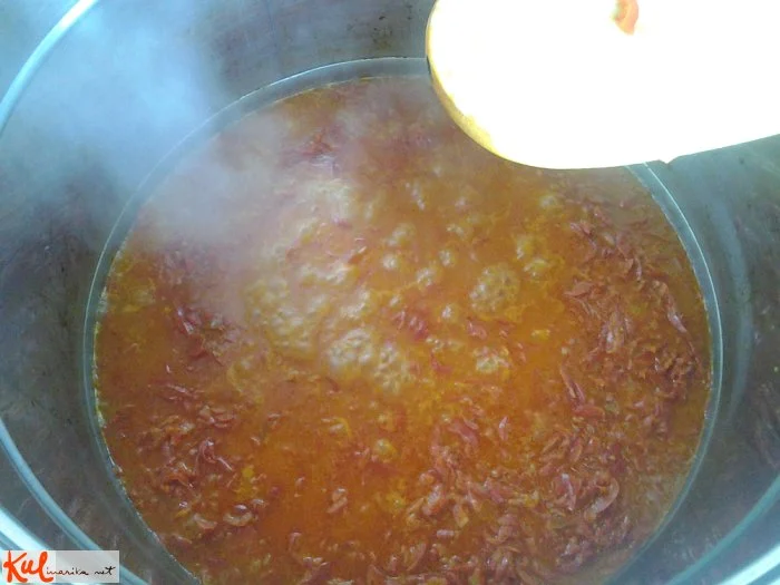 Najprej si v primerno posodo, ki mora biti dokaj velika, nalijemo belo olje in kis, da se nam kasneje ne začne takoj sprijemati. Papriko in paradižnik temeljito operemo ter očistimo, oboje narežemo na multipraktiku na grobi strani mreže in vsipamo v pripravljeno posodo. Ko imamo oboje narezano in v posodi, dodamo še sladkor in sol. Vse skupaj med stalnim mešanjem kuhamo do primerne gostote in šele na koncu dodamo gorčico in hren. Na hitro premešamo, da se ne zažge in s paličnim mešalnikom vse skupaj zmeljemo še na manjše koščke ter napolnimo v kozarčke. Jaz ga zavijem v odejo in pustim, da se ohladi. Nam je tak zelo dober, po želji lahko dodamo feferone. Pa dober tek!