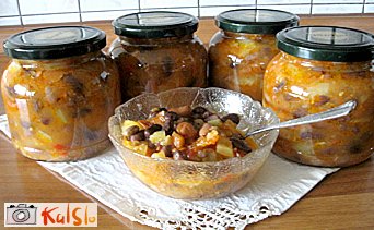 Čebulo prepražimo na olju, dodamo vse sestavine razen fižola, ki ga skuhamo posebej. V kuhano zelenjavo zamešamo še fižol in naložimo v vroče kozarce.