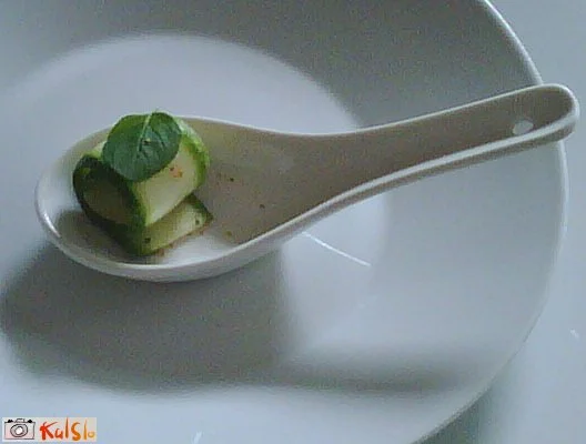 Avokado izdolbemo in sredico pretlačimo v skledici, da nastane gladka masa. Dodamo skuto in začimbe ter premešamo. Pustimo v hladilniku kakšno uro, da počiva. Bučke narežemo na tanke rezine z lupilcem, vanje zavijemo maso, postrežemo na žlici za kitajsko juho, na vrh zvitka dodamo še kapljico olivnega olja in zelo malo čilija ter dodamo metin list.