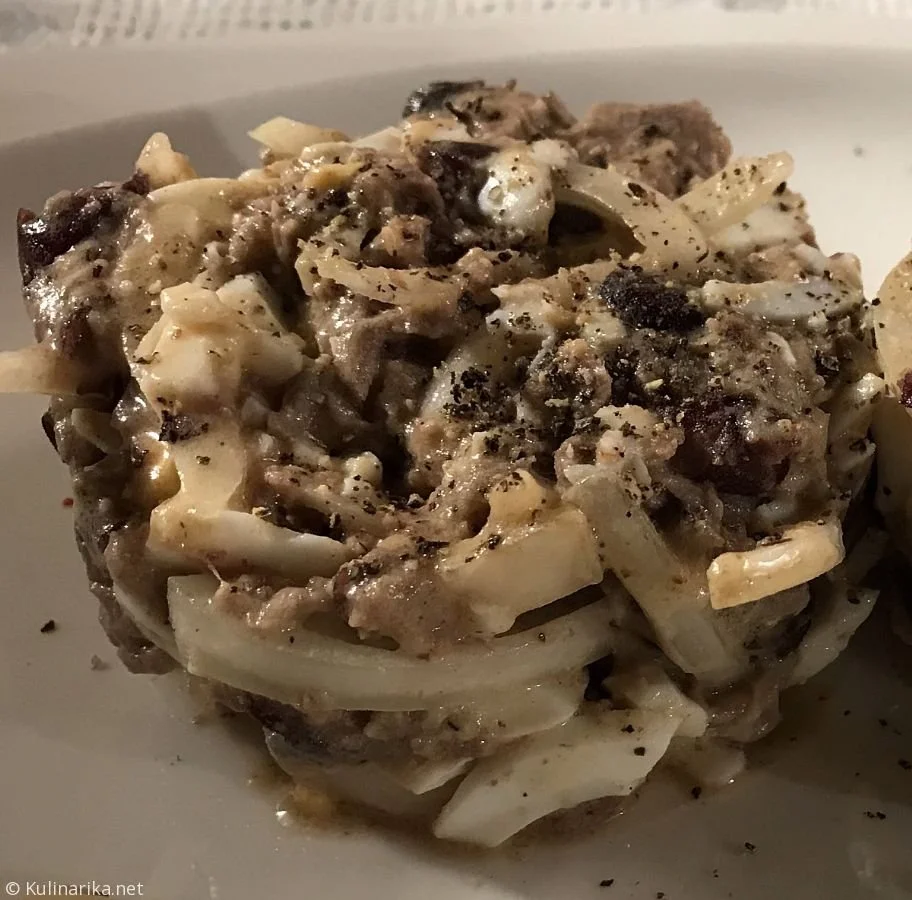 ne vem kako je z vami, ocenjevalci, pri nas na Štajerskem tej jedi rečemo rephendl. Delamo po osnovnm receptu, brez dodatkov. Govedino nareženo na tanke rezine, le-te se namreč lepše prepojijo z mešanico kisa, olja, čebule in česna ter soli in popra.
